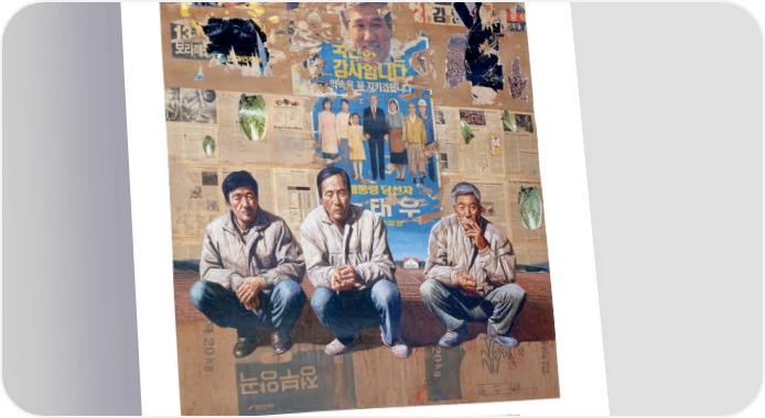 Fig. 41. Lee Jong- gu (이종구, b. 1954). Earth- at- Oziri (Oziri People) (국토 – 오지리에서 [오지리사람들]), 1988. Acrylic and collage on grain bag, 783/4 × 67 in. (200 × 170 cm). National Museum of Modern and Contemporary Art, Korea 38