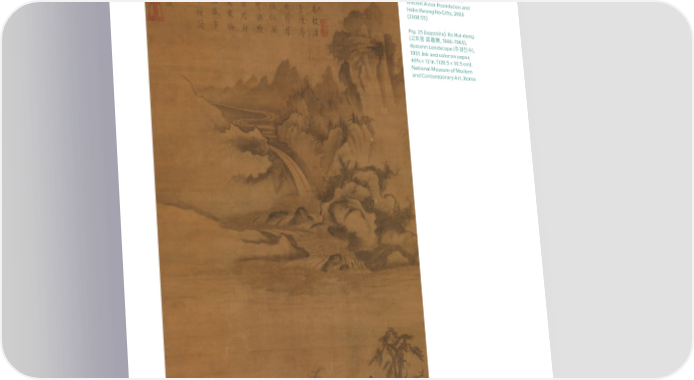 Fig. 24. Unidenti昀椀ed artist. Gathering of Government O昀케cials, Joseon dynasty (1392–1910), ca. 1551. Hanging scroll; ink and color on silk, 821/2 × 36 in. (209.6 × 91.4 cm). The Metropolitan Museum of Art, New York, Purchase, Acquisitions Fund, and The Vincent Astor Foundation and Hahn Kwang Ho Gi昀琀s, 2008 (2008.55) Fig. 25 (opposite). Ko Hui- dong (고희동 高羲東, 1886–1965). Autumn Landscape (추경산수), 1931. Ink and color on paper, 493/4 × 12 in. (126.5 × 30.5 cm). National Museum of Modern and Contemporary Art, Korea 20