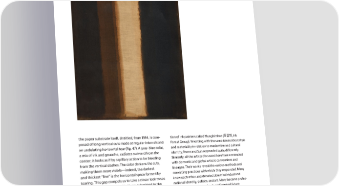 Fig. 46. Yun Hyong- keun (윤형근 尹亨根, 1928–2007). Umber Blue (청다), 1975. Oil on linen, 513/16 × 383/16 in. (130 × 97 cm). National Museum of Modern and Contemporary Art, Korea the paper substrate itself. Untitled, from 1984, is com- tion of ink painters called Munghimhoe (묵림회, Ink posed of long vertical cuts made at regular intervals and Forest Group). Wrestling with the same issues about style an undulating horizontal tear (昀椀g. 47). A gray- blue color, and materiality in relation to modernism and cultural a mix of ink and gouache, radiates outward from the identity, Kwon and Suh responded quite di昀昀erently. center; it looks as if by capillary action to be bleeding Similarly, all the artists discussed here have contended from the vertical slashes. The color darkens the cuts, with domestic and global artistic conventions and making them more visible—indeed, the darkest lineages. Their works reveal the various methods and and thickest “line” is the horizontal space formed by coexisting practices with which they responded. Many tearing. This gap compels us to take a closer look to see knew each other and debated about individual and if there is anything behind it. Kwon submitted to the national identity, politics, and art. Many became profes- paper by choosing to apply the color on the reverse and sors at the leading art schools and inspired future letting it seep through to the front. Thus, in returning to generations, creating legacies of their own. They are parts ink, Kwon challenged its supremacy and the o昀琀en- of a vast whole that makes up Korean art. Echoing the glamorized act of laying ink on paper. artists’ e昀昀orts against strict categorizations and fore- Kwon is a 昀椀tting close to this essay, since it began grounding the importance of retaining plurality, the use with Suh Se Ok. From the formal di昀昀erences in their of “s” in the exhibition title, as well as the plural form of works, it may come as a surprise that the two were each of the four themes, is as deliberate as the selection contemporaries and part of an in昀氀uential artist associa- of objects and their groupings into loose constellations. 44