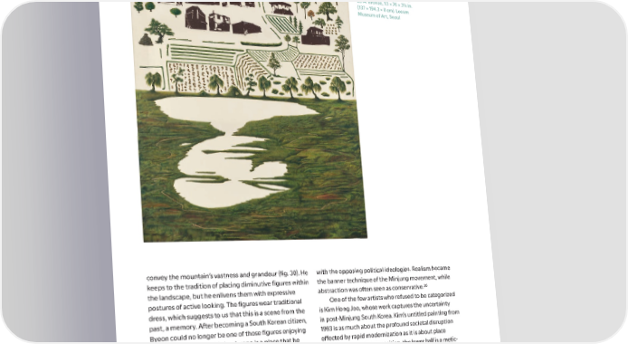 Fig. 31. Kim Hong Joo (김홍주 金洪疇, b. 1945). Untitled, 1993. Oil on canvas, 571/8 × 441/8 in. (145 × 112 cm). Leeum Museum of Art, Seoul Fig. 32 (opposite). Do Ho Suh (서도호 徐道濩, b. 1962). My/Our Country (우리 나라), 2014. Bronze, 53 × 76 × 35/8 in. (137 × 194.3 × 8 cm). Leeum Museum of Art, Seoul convey the mountain’s vastness and grandeur (昀椀g. 30). He with the opposing political ideologies. Realism became keeps to the tradition of placing diminutive 昀椀gures within the banner technique of the Minjung movement, while the landscape, but he enlivens them with expressive abstraction was o昀琀en seen as conservative.�� postures of active looking. The 昀椀gures wear traditional One of the few artists who refused to be categorized dress, which suggests to us that this is a scene from the is Kim Hong Joo, whose work captures the uncertainty past, a memory. A昀琀er becoming a South Korean citizen, in post- Minjung South Korea. Kim’s untitled painting from Byeon could no longer be one of those 昀椀gures enjoying 1993 is as much about the profound societal disruption Mount Geumgang—this landscape is a place that he e昀昀ected by rapid modernization as it is about place could not visit again. (昀椀g. 31). In this split composition, the lower half is a metic- A昀琀er decades of authoritarian rule, South Korea’s ulously painted so昀琀 grassland surrounding a reservoir. prodemocracy Minjung movement culminated in the At the dividing horizon line—an allusion to the partition 1980s with protests that were met with violent suppres- at the DMZ—the border of the pasture appears as sion. Nevertheless, this powerful movement led to arti昀椀cial as the blades of grass look real. In the upper half, constitutional changes and South Korea’s 昀椀rst demo- silk- screened photographs of new and old buildings cratic elections, in 1987. Like the political milieu, artists 昀氀oat alongside painted rootless trees and planted 昀椀elds were divided into factions, with certain styles associated within a 昀氀at, unpainted vertical plane. Looking again, we 28
