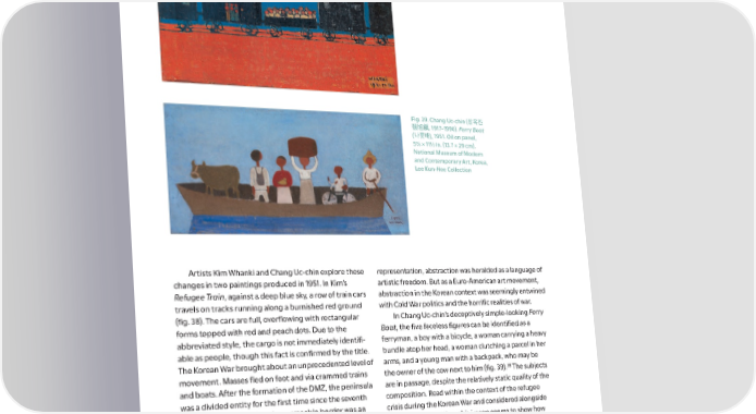Fig. 38. Kim Whanki (김환기 金煥基, 1913–1974). Refugee Train (피난열차), 1951. Oil on canvas, 141/2 × 201/2 in. (37 × 52 cm). Private collection Fig. 39. Chang Uc- chin (장욱진 張旭鎭, 1917–1990). Ferry Boat (나룻배), 1951. Oil on panel, 53/8 × 111/2 in. (13.7 × 29 cm). National Museum of Modern and Contemporary Art, Korea, Lee Kun- Hee Collection Artists Kim Whanki and Chang Uc- chin explore these representation, abstraction was heralded as a language of changes in two paintings produced in 1951. In Kim’s artistic freedom. But as a Euro- American art movement, Refugee Train, against a deep blue sky, a row of train cars abstraction in the Korean context was seemingly entwined travels on tracks running along a burnished red ground with Cold War politics and the horri昀椀c realities of war. (昀椀g. 38). The cars are full, over昀氀owing with rectangular In Chang Uc- chin’s deceptively simple-looking Ferry forms topped with red and peach dots. Due to the Boat, the 昀椀ve faceless 昀椀gures can be identi昀椀ed as a abbreviated style, the cargo is not immediately identi昀椀- ferryman, a boy with a bicycle, a woman carrying a heavy able as people, though this fact is con昀椀rmed by the title. bundle atop her head, a woman clutching a parcel in her The Korean War brought about an unprecedented level of arms, and a young man with a backpack, who may be movement. Masses 昀氀ed on foot and via crammed trains the owner of the cow next to him (昀椀g. 39).�� The subjects and boats. A昀琀er the formation of the DMZ, the peninsula are in passage, despite the relatively static quality of the was a divided entity for the 昀椀rst time since the seventh composition. Read within the context of the refugee century. Partition with an impermeable border was an crisis during the Korean War and considered alongside inconceivable outcome. The numerous refugee settle- Kim Whanki’s painting, this image seems to show how ments that sprang up were thought to be temporary; those Chang too grappled with the tide of people 昀氀eeing war in who had come south would return home a昀琀er the turmoil. search of shelter, carrying their lives on their heads and But with the DMZ, movement became displacement, backs. Chang’s straightforward painting style echoes his escape became migration, and momentary separation proclamation of being a simple man, but it does not limit became permanent rupture. Small as it is, Kim’s painting his expressiveness. Through his use of simple forms, suggests the ways in which the war placed pressure Chang is also able to convey loss, isolation, and bereave- upon the language of formal abstraction. Breaking from ment without formally depicting trauma. 36