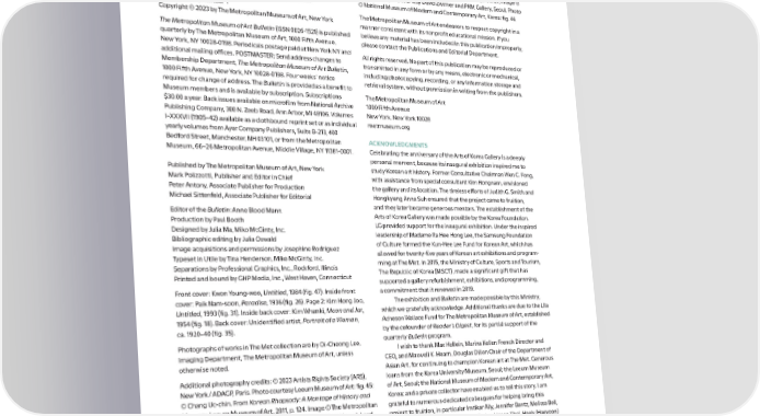 This publication is issued in conjunction with Lineages: Korean Art at 昀椀gs. 28, 29; Photo © National Museum of Modern and Contemporary The Met, on view at The Metropolitan Museum of Art, New York, from Art, Korea: 昀椀g. 25; © The Estate of Paik Nam-soon. Photo © National November 7, 2023, through October 20, 2024. Museum of Modern and Contemporary Art, Korea: 昀椀g. 26; © The Estate The exhibition and Bulletin are made possible by the Ministry of of Park Soo-keun. Photo courtesy Leeum Museum of Art: 昀椀g. 40; © Suh Culture, Sports and Tourism, The Republic of Korea (MCST). Se Ok. Photo © National Museum of Modern and Contemporary Art, Korea: 昀椀g. 1; © Do Ho Suh. Photo courtesy of Leeum Museum of Art: The Metropolitan’s quarterly Bulletin program is supported in part by 昀椀g. 32; © Whanki Foundation-Whanki Museum, photo courtesy Whanki the Lila Acheson Wallace Fund for The Metropolitan Museum of Art, Foundation: 昀椀gs. 18, 38; © The Estate of Lee Yootae. Photo © National established by the cofounder of Reader’s Digest. Museum of Modern and Contemporary Art, Korea: 昀椀gs. 36, 27; Image © Yun Seong-ryeol, courtesy David Zwirner and PKM Gallery, Seoul. Photo The Metropolitan Museum of Art Bulletin, Summer 2023 © National Museum of Modern and Contemporary Art, Korea: 昀椀g. 46 Volume LXXXI, Number 1 The Metropolitan Museum of Art endeavors to respect copyright in a Copyright © 2023 by The Metropolitan Museum of Art, New York manner consistent with its nonpro昀椀t educational mission. If you The Metropolitan Museum of Art Bulletin (ISSN 0026-1521) is published believe any material has been included in this publication improperly, quarterly by The Metropolitan Museum of Art, 1000 Fi昀琀h Avenue, please contact the Publications and Editorial Department. New York, NY 10028-0198. Periodicals postage paid at New York NY and All rights reserved. No part of this publication may be reproduced or additional mailing o昀케ces. POSTMASTER: Send address changes to transmitted in any form or by any means, electronic or mechanical, Membership Department, The Metropolitan Museum of Art Bulletin, including photocopying, recording, or any information storage and 1000 Fi昀琀h Avenue, New York, NY 10028-0198. Four weeks’ notice retrieval system, without permission in writing from the publishers. required for change of address. The Bulletin is provided as a bene昀椀t to Museum members and is available by subscription. Subscriptions The Metropolitan Museum of Art $30.00 a year. Back issues available on micro昀椀lm from National Archive 1000 Fi昀琀h Avenue Publishing Company, 300 N. Zeeb Road, Ann Arbor, MI 48106. Volumes New York, New York 10028 I–XXXVII (1905–42) available as a clothbound reprint set or as individual metmuseum.org yearly volumes from Ayer Company Publishers, Suite B-213, 400 Bedford Street, Manchester, NH 03101, or from the Metropolitan ACKNOWLEDGMENTS Museum, 66–26 Metropolitan Avenue, Middle Village, NY 11381-0001. Celebrating the anniversary of the Arts of Korea Gallery is a deeply personal moment, because its inaugural exhibition inspired me to Published by The Metropolitan Museum of Art, New York study Korean art history. Former Consultative Chairman Wen C. Fong, Mark Polizzotti, Publisher and Editor in Chief with assistance from special consultant Kim Hongnam, envisioned Peter Antony, Associate Publisher for Production the gallery and its location. The tireless e昀昀orts of Judith G. Smith and Michael Sittenfeld, Associate Publisher for Editorial Hongkyung Anna Suh ensured that the project came to fruition, Editor of the Bulletin: Anne Blood Mann and they later became generous mentors. The establishment of the Production by Paul Booth Arts of Korea Gallery was made possible by the Korea Foundation. Designed by Julia Ma, Miko McGinty, Inc. LG provided support for the inaugural exhibition. Under the inspired Bibliographic editing by Julia Oswald leadership of Madame Ra Hee Hong Lee, the Samsung Foundation Image acquisitions and permissions by Josephine Rodriguez of Culture formed the Kun-Hee Lee Fund for Korean Art, which has Typeset in Utile by Tina Henderson, Miko McGinty, Inc. allowed for twenty-昀椀ve years of Korean art exhibitions and program- Separations by Professional Graphics, Inc., Rockford, Illinois ming at The Met. In 2015, the Ministry of Culture, Sports and Tourism, Printed and bound by GHP Media, Inc., West Haven, Connecticut The Republic of Korea (MSCT), made a signi昀椀cant gi昀琀 that has supported a gallery refurbishment, exhibitions, and programming, Front cover: Kwon Young-woo, Untitled, 1984 (昀椀g. 47). Inside front a commitment that it renewed in 2019. cover: Paik Nam-soon, Paradise, 1936 (昀椀g. 26). Page 2: Kim Hong Joo, The exhibition and Bulletin are made possible by this Ministry, Untitled, 1993 (昀椀g. 31). Inside back cover: Kim Whanki, Moon and Jar, which we gratefully acknowledge. Additional thanks are due to the Lila 1954 (昀椀g. 18). Back cover: Unidenti昀椀ed artist, Portrait of a Woman, Acheson Wallace Fund for The Metropolitan Museum of Art, established ca. 1920–40 (昀椀g. 35). by the cofounder of Reader’s Digest, for its partial support of the Photographs of works in The Met collection are by Oi-Cheong Lee, quarterly Bulletin program. Imaging Department, The Metropolitan Museum of Art, unless I wish to thank Max Hollein, Marina Kellen French Director and otherwise noted. CEO, and Maxwell K. Hearn, Douglas Dillon Chair of the Department of Asian Art, for continuing to champion Korean art at The Met. Generous Additional photography credits: © 2023 Artists Rights Society (ARS), loans from the Korea University Museum, Seoul; the Leeum Museum New York / ADAGP, Paris. Photo courtesy Leeum Museum of Art: 昀椀g. 45; of Art, Seoul; the National Museum of Modern and Contemporary Art, © Chang Uc-chin. From Korean Rhapsody: A Montage of History and Korea; and a private col