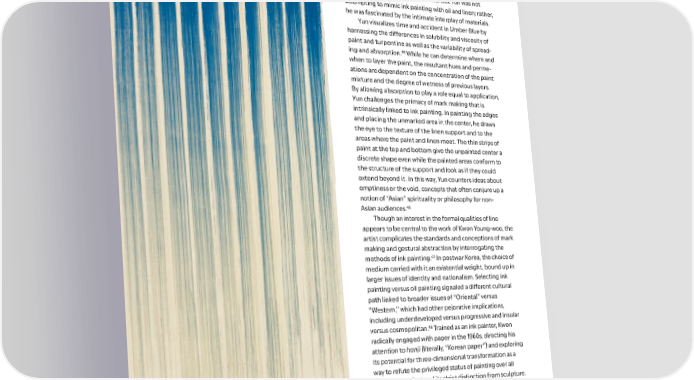 1975, is composed of obfuscated layers of pigment that create varying degrees of darkness (昀椀g. 46). When looking at the thinned and layered paint, the visible brushstrokes, the blurred lines, and the weave of the linen in the unpainted areas, it is as if one has zoomed in very close to a section of an ink painting to examine the interactions between the paint and its substrate. But Yun was not attempting to mimic ink painting with oil and linen; rather, he was fascinated by the intimate interplay of materials. Yun visualizes time and accident in Umber Blue by harnessing the di昀昀erences in solubility and viscosity of paint and turpentine as well as the variability of spread- ing and absorption.�� While he can determine where and when to layer the paint, the resultant hues and perme- ations are dependent on the concentration of the paint mixture and the degree of wetness of previous layers. By allowing absorption to play a role equal to application, Yun challenges the primacy of mark making that is intrinsically linked to ink painting. In painting the edges and placing the unmarked area in the center, he draws the eye to the texture of the linen support and to the areas where the paint and linen meet. The thin strips of paint at the top and bottom give the unpainted center a discrete shape even while the painted areas conform to the structure of the support and look as if they could extend beyond it. In this way, Yun counters ideas about emptiness or the void, concepts that o昀琀en conjure up a notion of “Asian” spirituality or philosophy for non- Asian audiences.�� Though an interest in the formal qualities of line appears to be central to the work of Kwon Young- woo, the artist complicates the standards and conceptions of mark making and gestural abstraction by interrogating the methods of ink painting.�� In postwar Korea, the choice of medium carried with it an existential weight, bound up in larger issues of identity and nationalism. Selecting ink painting versus oil painting signaled a di昀昀erent cultural path linked to broader issues of “Oriental” versus “Western,” which had other pejorative implications, including underdeveloped versus progressive and insular versus cosmopolitan.�� Trained as an ink painter, Kwon radically engaged with paper in the 1960s, directing his attention to hanji (literally, “Korean paper”) and exploring its potential for three- dimensional transformation as a way to refute the privileged status of painting over all other forms of art and its strict distinction from sculpture. Paper, as one of the Three Friends of the Scholar, is revered as an indispensable component of ink painting and calligraphy but usually as a support for ink and brush. By tearing, pasting, and molding, Kwon extricated paper from its substrate role and brought it to the forefront. During the 1980s, while living in Paris, Kwon reen- gaged with ink and color while still drawing attention to 43