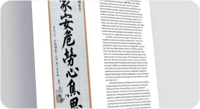 impart mantras, lament injustice, and inspire action. Ahn received a classical education, and as a young man witnessing the whittling away of Korea’s sovereignty, he devoted himself to studying geopolitics and history and sought to educate others by establishing schools. In 1907 he moved to the Vladivostok region (then Manchuria) to join fellow Korean independence activists. A昀琀er hearing that Itō Hirobumi (伊藤 博文, 1841–1909), a Japanese politician who served as the 昀椀rst resident- general of Korea, would be passing through Manchuria, Ahn and others devised a plan to assassinate Itō; as a pledge to the plan, the activists each cut o昀昀 the last joint of their ring 昀椀nger. Ahn intercepted and fatally shot Itō at the Harbin Railway Station before being caught by the authorities. During his nearly six- month imprisonment before execution, Ahn wrote his autobiography and made calligraphic works that were much admired (昀椀g. 44). On these works, he imprinted his self- mutilated le昀琀 hand, a visual mark of his pledge and a poignant nod to the connection of a calligrapher’s hand, heart, and mind. Lee Ufan channels the energetic precision of cal- ligraphic strokes in his abstract paintings.�� The act of using a brush until the pigment it holds diminishes gradually to barely leave a mark is a calligraphic conven- tion that Lee deliberately evokes in the 1979 painting From Line (昀椀g. 45). Here, the closely spaced linear rows that start at the top edge and 昀椀ll the entire length of the canvas make the viewer aware of the large dimensions of the work. The lack of a border creates a sense of fullness, even though each line fades and dissolves. Before moving to Japan in 1956, Lee studied ink painting with Suh Se Ok. Lee’s ability to produce a series of straight lines of equal width demonstrates his rigorous calligraphic discipline. Against the lineages of black calligraphy and ink painting, Lee chose to employ a blue pigment, derived from cobalt and cadmium.�� Individuals like Lee recognized the numerous opposi- tional categories by which pre- and postwar artists and their works were being de昀椀ned, such as traditional versus modern, ink versus oil, and representation versus abstraction. Lee grapples with these binaries by bringing together unlikely combinations of materials, objects, and concepts. From Line is evidence of this practice, as the painted line is both solid and porous and the visual 昀椀eld is full and empty. Lee’s embrace of the both- and paradigm is also present in the work’s title—“from” is as important as “line,” since it indicates a start, a process, and signals open- endedness and is not a de昀椀nitive statement. Like Lee Ufan, Yun Hyong- keun steered away from Fig. 44. Ahn Junggeun (안중근 安重根, 1879–1910). black in his paintings, because he understood that it had One Takes Pain and Worries for the Safety and become a signi昀椀er of ink. He employed burnt umber and Danger of the Country (국가안위노심초사), 1909. Ink ultramarine, which are foregrounded in the titles of his on silk, 585/8 × 15 in. (149 × 38.2 cm). Ahn Junggeun Memorial Museum, Seoul, Treasure no. 569-21 works. Though it does not appear blue, Umber Blue, from 41