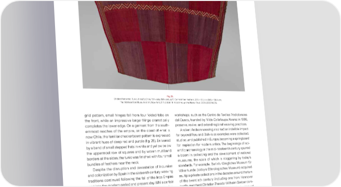 Fig. 25. Unidenti昀椀ed artist. Tunic. Arica(?), Chile, 15th–early 16th century(?). Camelid 昀椀ber, feathers, 35 ⼀攀 × 54 ⼀挀 in. (89.5 × 138.4 cm). The Metropolitan Museum of Art, New York, Gift of John B. Elliott through the Mercer Trust, 2000 (2000.160.25) grid pattern, small fringes fall from four folded tabs on workshops, such as the Centro de Textiles Tradicionales the front, while an impressive longer fringe dramatically del Cusco, founded by Nilda Callañaupa Alvarez in 1996, completes the lower edge. On a garment from the south- preserve, revive, and extend regional weaving practices. ernmost reaches of the empire, on the coast of what is Ancient Andean weaving also had an indelible impact now Chile, the familiar checkerboard pattern is expressed far beyond Peru and Bolivia as examples were collected, in vibrant hues of deep red and purple (昀椀g. 25). Enlivened studied, and published in Europe, becoming a springboard by a band of small stepped frets in white and yellow below for inspiration for modern artists. The beginnings of sci- the uppermost row of squares and by woven multiband enti昀椀c archaeology in the mid-nineteenth century spurred borders at the sides, the tunic was 昀椀nished with four small a boom in collecting and the development of national bundles of feathers near the neck. museums, the scale of which is staggering by today’s Despite the disruption and devastation of incursion standards. For example, Berlin’s Königliches Museum für and colonization by Spain in the sixteenth century, weaving Völkerkunde (today’s Ethnologisches Museum) acquired traditions continued following the fall of the Inca Empire multiple private collections in the decades around the turn and into the modern period and present day. While certain of the twentieth century, including one from Hannover types of garments, such as the black-and-white checker- textile merchant Christian Theodor Wilhelm Gretzer com- board tunics, stopped being produced, others evolved prising some 33,000 ancient American objects, many of 20 according to changing tastes and needs. Indeed, many them textiles. weaving traditions have remained strong, particularly in Information about ancient Andean textiles also 19 circulated through illustrated publications. Notably, the southern highlands of Peru and Bolivia. Today vibrant 24