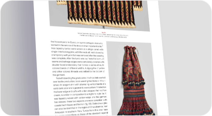 Fig. 23. Central Coast artist. Shirt. Peru, 1460–1540. Cotton, camelid 昀椀ber, 19 × 47 in. (48.3 × 119.4 cm). The Metropolitan Museum of Art, New York, Gift of Arthur M. Bullowa, 1983 (1983.497.1) the Inca emperor in Cusco, or cumbi camayos, men who 17 worked in the service of the Inca or other important lords. Inca tapestry tunics were woven as a single panel with single-interlocking joins, with the neck slit held closed by a temporary weft yarn that was removed after the weaving was complete. After the tunic was cut from the loom, all seams and selvage edges were completely covered with double-faced embroidery that formed a series of multi- colored bands of different widths. A zigzag line of yellow and other colored threads was added to the bottom of the garment. Notwithstanding the great control the Inca state exerted over textile production, local weaving traditions still 昀氀our- ished. An elegant shirt with alternating vertical bands of a solid dark color and a geometric wave pattern, 昀椀nished on the lower edge and cuffs with a dark stepped-fret motif on cream, is similar in composition to a highland style, but it was tapestry woven with cotton warps, and the garment has sleeves: these two aspects are more consistent with coastal techniques and fashion (昀椀g. 23). Distinctive styles can also be identi昀椀ed in the region of Chuquibamba, near Arequipa in southern Peru. Tunics from this area have the same proportions as those of the standard imperial style, yet the designs are speci昀椀cally local, with small- scale motifs, such as eight-point stars and stylized 昀椀sh, repeated in a grid pattern (昀椀g. 22).18 As with earlier North Coast textiles, they were sometimes embellished, as seen in a Chuquibamba-style bag (昀椀g. 24). Here, against a woven Fig. 24. Chuquibamba artist. Bag with fringe. South Coast, Peru, 12th–16th century. Camelid 昀椀ber, 27 ⼀攀 × 9 ⼀攀 in. (69.2 × 23.5 cm). The Metropolitan Museum of Art, New York, Rogers Fund, 2001 (2001.489) 23
