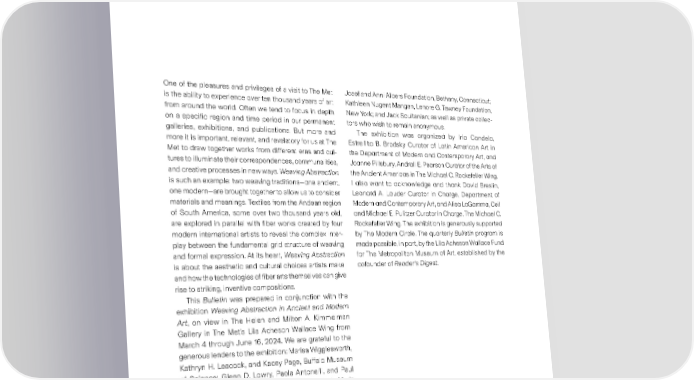 Director’s Note One of the pleasures and privileges of a visit to The Met Josef and Anni Albers Foundation, Bethany, Connecticut; is the ability to experience over ten thousand years of art Kathleen Nugent Mangan, Lenore G. Tawney Foundation, from around the world. Often we tend to focus in depth New York; and Jack Soultanian; as well as private collec - on a speci昀椀c region and time period in our permanent tors who wish to remain anonymous. galleries, exhibitions, and publications. But more and The exhibition was organized by Iria Candela, more it is important, relevant, and revelatory for us at The Estrellita B. Brodsky Curator of Latin American Art in Met to draw together works from different eras and cul- the Department of Modern and Contemporary Art, and tures to illuminate their correspondences, communalities, Joanne Pillsbury, Andrall E. Pearson Curator of the Arts of and creative processes in new ways. Weaving Abstraction the Ancient Americas in The Michael C. Rockefeller Wing. is such an example: two weaving traditions—one ancient, I also want to acknowledge and thank David Breslin, one modern—are brought together to allow us to consider Leonard A. Lauder Curator in Charge, Department of materials and meanings. Textiles from the Andean region Modern and Contemporary Art, and Alisa LaGamma, Ceil of South America, some over two thousand years old, and Michael E. Pulitzer Curator in Charge, The Michael C. are explored in parallel with 昀椀ber works created by four Rockefeller Wing. The exhibition is generously supported modern international artists to reveal the complex inter- by The Modern Circle. The quarterly Bulletin program is play between the fundamental grid structure of weaving made possible, in part, by the Lila Acheson Wallace Fund and formal expression. At its heart, Weaving Abstraction for The Metropolitan Museum of Art, established by the is about the aesthetic and cultural choices artists make, cofounder of Reader’s Digest. and how the technologies of 昀椀ber arts themselves can give rise to striking, inventive compositions. This Bulletin was prepared in conjunction with the exhibition Weaving Abstraction in Ancient and Modern Art, on view in The Helen and Milton A. Kimmelman Gallery in The Met’s Lila Acheson Wallace Wing from March 4 through June 16, 2024. We are grateful to the generous lenders to the exhibition: Marisa Wigglesworth, Kathryn H. Leacock, and Kacey Page, Buffalo Museum of Science; Glenn D. Lowry, Paola Antonelli, and Paul Galloway, The Museum of Modern Art, New York; Maria Nicanor and Susan Brown, Cooper Hewitt, Smithsonian Design Museum, New York; Timothy R. Rodgers and Elissa Max Hollein Auther, Museum of Arts and Design, New York; Nicholas Marina Kellen French Director and CEO Fox Weber, Brenda Danilowitz, and Karis Medina, The The Metropolitan Museum of Art 3