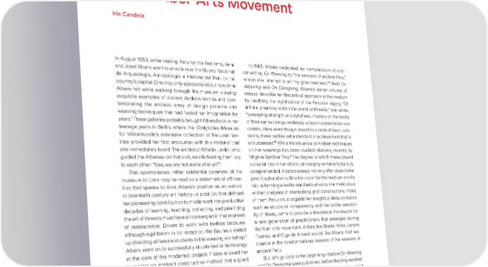 Abstraction and Andean Textiles, from Anni Albers to the Fiber Arts Movement Iria Candela In August 1953, while visiting Peru for the 昀椀rst time, Anni In 1965, Albers dedicated her compendium of criti- and Josef Albers went to what is now the Museo Nacional cal writing On Weaving to “the weavers of ancient Peru,” de Arqueología, Antropología e Historia del Perú in the whom she referred to as “my great teachers.”4 Both On country’s capital. One may only speculate about how Anni Weaving and On Designing, Albers’s earlier volume of Albers felt while walking through the museum, viewing essays, describe her theoretical approach to the medium exquisite examples of ancient Andean textiles and con- by crediting the signi昀椀cance of the Peruvian legacy. “Of templating the endless array of design patterns and in昀椀nite phantasy within the world of threads,” she wrote, weaving techniques that had fueled her imagination for “conveying strength or playfulness, mystery or the reality 1 years. These galleries probably brought Albers back to her of their surroundings, endlessly varied in presentation and teenage years in Berlin, where the Königliches Museum construction, even though bound to a code of basic con- für Völkerkunde’s extensive collection of Peruvian tex- cepts, these textiles set a standard of achievement that is 5 tiles provided her 昀椀rst encounter with this material that unsurpassed.” While the in昀氀uence of Andean techniques she immediately loved. The architect Alfredo Linder, who on her weavings has been studied relatively recently by 6 guided the Alberses on that visit, recalls hearing them say Virginia Gardner Troy, the degree to which these played 2 to each other: “See, we are not alone after all.” a crucial role in her artistic philosophy remains to be fully That spontaneous, rather existential comment at the comprehended. Albers’s essays not only offer clues to her museum in Lima may be read as a statement of af昀椀rma- practice, but also outline her vision for the medium and its tion that speaks to Anni Albers’s position as an outcast future, forming a textile manifesto of sorts. Her meticulous in twentieth-century art history—a position that de昀椀ned written analyses of interlocking grid constructions, many her pioneering contribution to modern art. Her productive of them Peruvian, alongside her insightful ideas on topics decades of learning, teaching, collecting, and practicing such as structural transparency and the tactile sensibil - the art of threads must have all converged in that moment ity of 昀椀bers, came to provide a theoretical framework for of reassurance. Driven to work with textiles because, a new generation of practitioners that emerged during although egalitarian in its inception, the Bauhaus ended the 昀椀ber arts movement. Artists like Sheila Hicks, Lenore 3 Tawney, and Olga de Amaral would, like Albers, 昀椀nd res up directing all female students to the weaving workshop, - Albers went on to successfully situate textile technology onance in the transformational lessons of the weavers of at the core of the modernist project. Fibers allowed her ancient Peru. to master an abstract constructive method that aligned But let’s go back to the beginning—before On Weaving with some of the avant-garde aspirations of her contem- and On Designing were published, before the long-awaited poraries from De Stijl, Constructivism, and the Bauhaus: trip to Lima in 1953—to Anni Albers’s upbringing amid that is, to achieve a unity of the arts through the universal the artistic debates held in Europe in the early decades vocabulary of abstraction and to commit to a utilitarian of the twentieth century. Within the artistic community, drive amid an increasingly industrial society. there was a shared concern that the 昀椀gurative tradition 27
